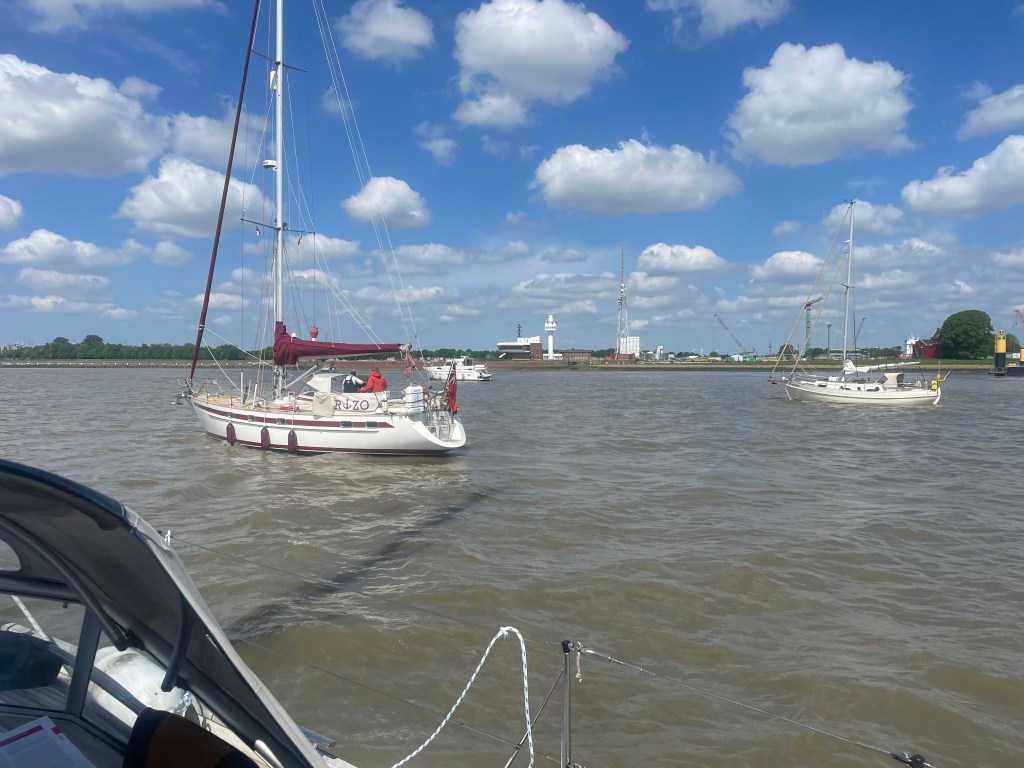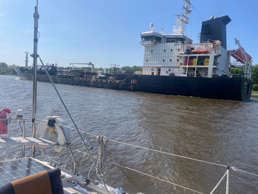 We slept well (again) and mid morning the next day started another long passage to Cuxhaven, aiming to get into the Elbe estuary as the flood started. It is a long way in, with shallows to the south and a considerable distance to sail before you have a semblance of a river forming. Again, we got in at dusk, and I had a whisky on Hero to discuss the day’s sail and plans for next day. Transiting the Kiel canal was the objective, and we motored out down the Elbe for 15 miles or so and waited for the lock at Brunsbüttel to open. The locks are huge, originally designed to take WWI Dreadnought battleships, and now quite large container ships and tankers.