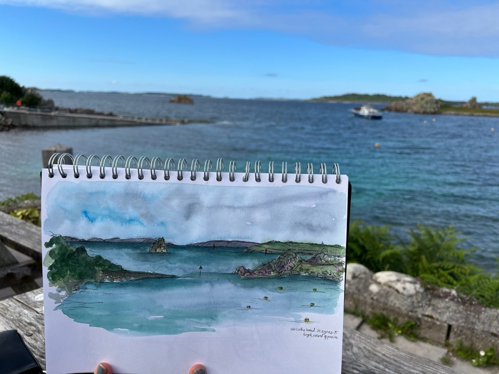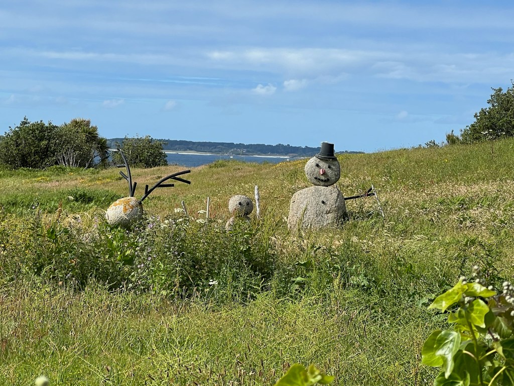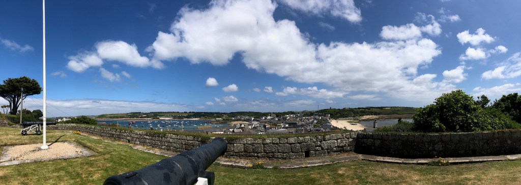 The next day we motored round to Porth Cressa, where we anchored and enjoyed Hugh Town on St Mary’s, visiting (inevitably) the IoS clothing shop, and buying various things. We enjoyed a walk above the town, visiting ramparts, one of which was named after one of Karenza’s ancestors.