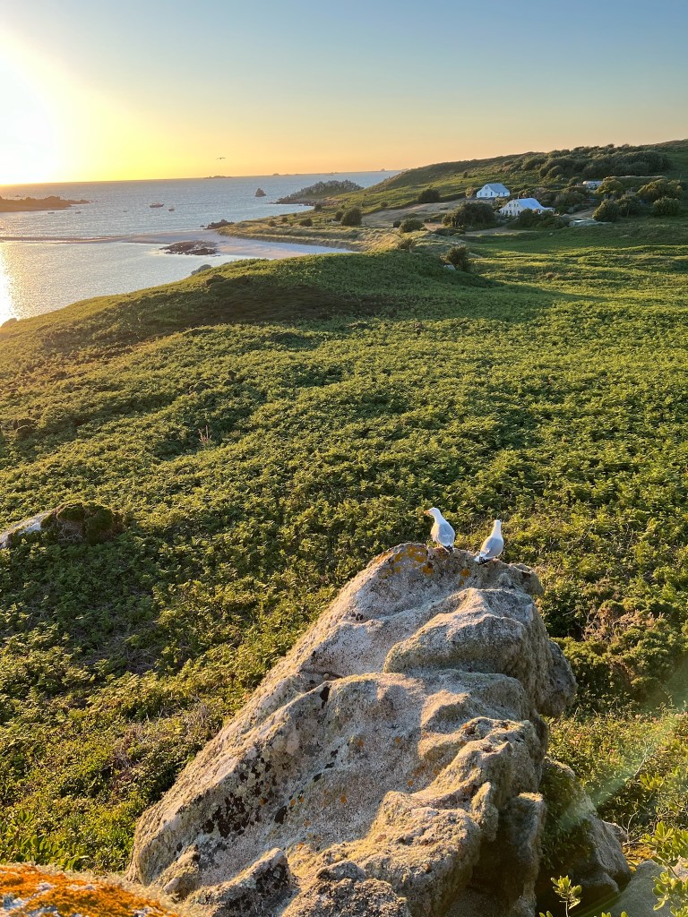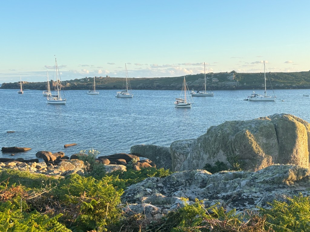 A few hours after Alex departed by train, I was joined by new crew Karenza and Rose, who had arrived at Penzance by more traditional locomotive. I showed them around Spellbinder, cooked them supper and we retired early to lock out at 0730 the next morning, taking on water then anchoring outside the harbour for a few hours to await a fair tide around Land’s End. There then followed a great sail to Scilly, where after a few hours we arrived at The Cove, my favourite of the archipelago anchorages, located between St Agnes and Gugh. We arrived in time for a lovely stroll around both islands – the former before supper, and the latter after dinner to watch the sunset.