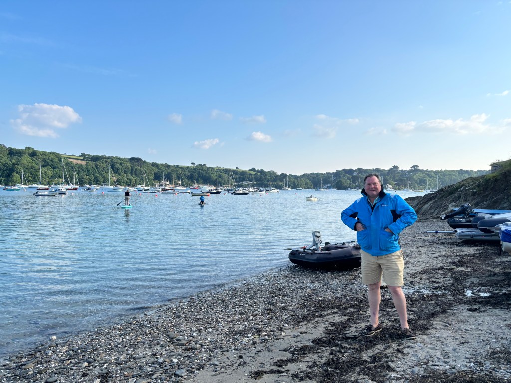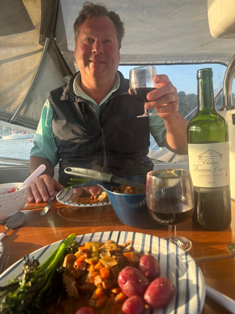 Having said goodbye to Bash and Tom by steam train at Kingswear (opposite Dartmouth), I greeted my next crew Alex coming off a similarly-powered locomotive. It really isn’t a bad way to arrive at or depart from a yacht! I had anchored Spellbinder as I often do in the main Dartmouth roadstead, and after motoring up the river and showing Dittisham to Alex, we re-anchored and were royally entertained by RYS friends Merrick and Emma and their crew.