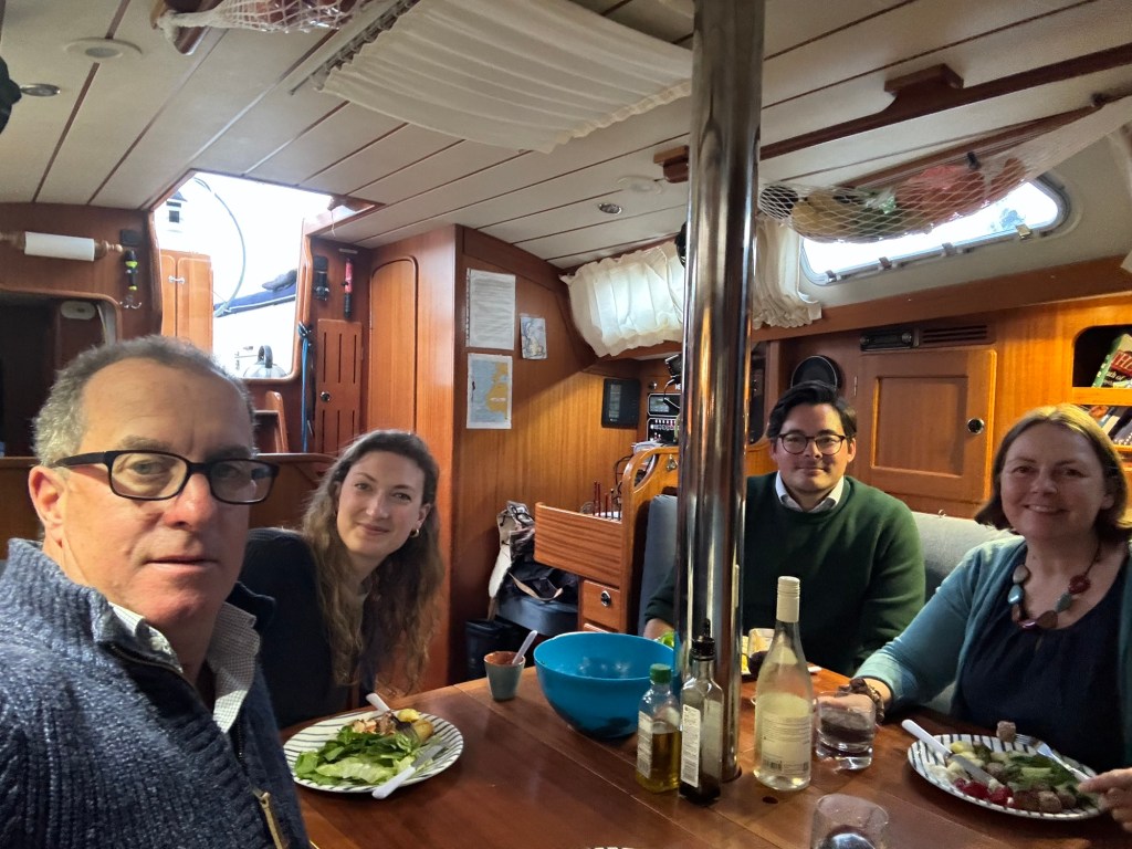 The next day we motored along the coast in calm conditions into Kinsale. It’s a lively town, known for its gastronomy these days, but in times past for its history, including the defeat of some of the Spanish Armada. We strolled to Charles Fort and back, enjoyed a drinks party at a Member’s house, then sat out a rainy day exploring the town. By now Charles’s wife Caroline had joined us.