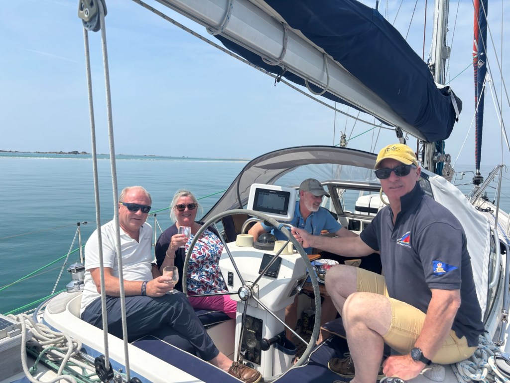On Jersey we berthed in the main marina in Saint Helier, and Sue joined us by ferry from Poole. The following morning visited the war tunnels, which were very interesting, explaining the difficult period for Jersey in WW2. Later, despite a bit of a downpour, we managed to enjoy a club dinner with the Jersey governor in a marquee in the grounds of his Government House. Walking off the previous evening, the next day we were hosted by another member who lives on Jersey, walking his local beach, and by yet another for dinner. It was all very social.