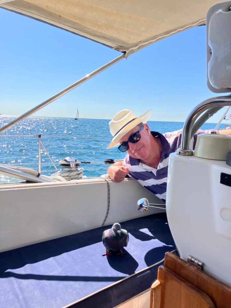 As we neared the English coast we were joined by a racing pigeon. Its tag suggested it was Belgian. It hitched a lift all the way into Salcombe.
